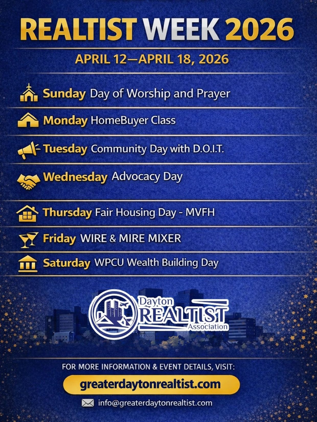 REALTIST Week 2026 is a week-long series of impactful events hosted by the Dayton Realtist Association, dedicated to advancing fair housing, homeownership education, community advocacy, professional networking, and wealth building. This annual celebration brings together real estate professionals, community partners, and residents to empower families, strengthen neighborhoods, and create lasting change across Greater Dayton.